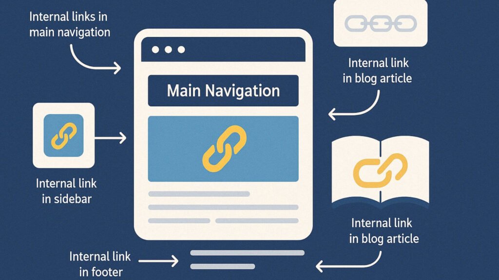 These links typically appear in places like main navigation menus, sidebars, footers, within blog articles as contextual links, and as breadcrumb trails.